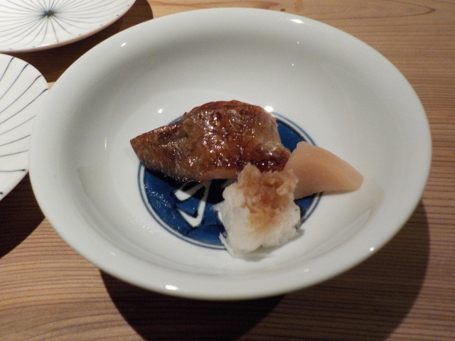 この頃には周囲は満席で、毎回冷えた可杯スタイルのグラスを交換して戴くのがフロアのおねーさんに申し訳なってきたので、小2合徳利にして貰った。お酒は而今。嫁の一番好きな酒を3人で飲んだのだが、私には今日初めて戴いたPBの惣邑のほうが旨いかも。