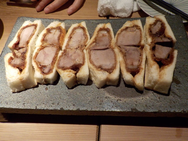 ぼちぼち料理も終盤へ。 ローストビーフの焼きサンド。まてぃさんをはじめ、皆さんが褒めていたビフカツサンドであるが、鼓太郎さんによると、「ビフカツ指定で来られるお客さんもいるが、肉質で料理を変えている。赤身肉がいいときはビフカツにするが今日はローストビーフがいいんです。」とのこと。まてぃさんたちのレビューに影響されたお客さんにちょっとだけ困っておられるようであった。(笑)ローストビーフサンドも酸味が効いていて実にいい味だった。