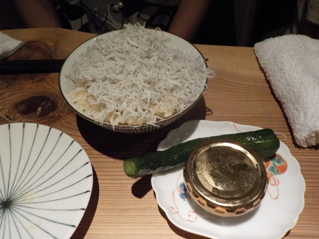 ・最後シラス御飯>和歌山のしらすだそうで、いい塩梅でした。きゅうりの一本漬がついてます。