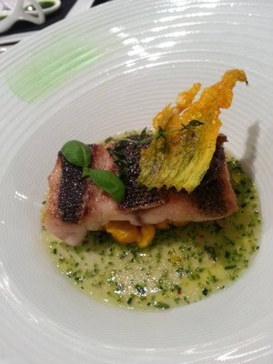 花ズッキーニの飾りが美味しく、イサキの下にヒヨコ豆とナージュソースが合ってます