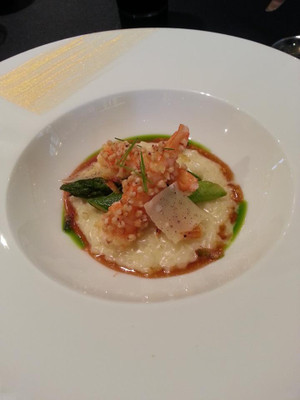 天使の海老 蕎麦の実のスフレをまとわせ、グリーンアスパラガスを添え、パルメザンのリゾットと共に