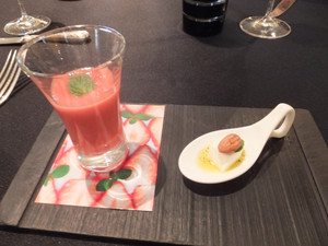アミューズブッシュ、トマトの下には、イチゴの冷たいスープ、チーズの上にアーモンド、その上から魚醤をかけ