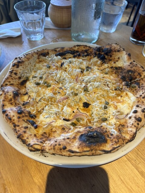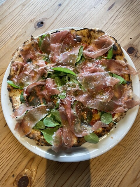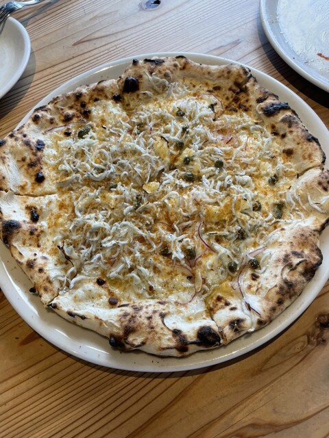 今年も食べにきましたFermenCoのサワードウピッツァです。私的食べログで唯一の5点満、そのために旅行する価値のある飲食店です。今回の注文はマルゲリータとシラスとカラスミのピッツァです。何回食べても美味しく、何度も見ても入田浜の眺めは最高です。