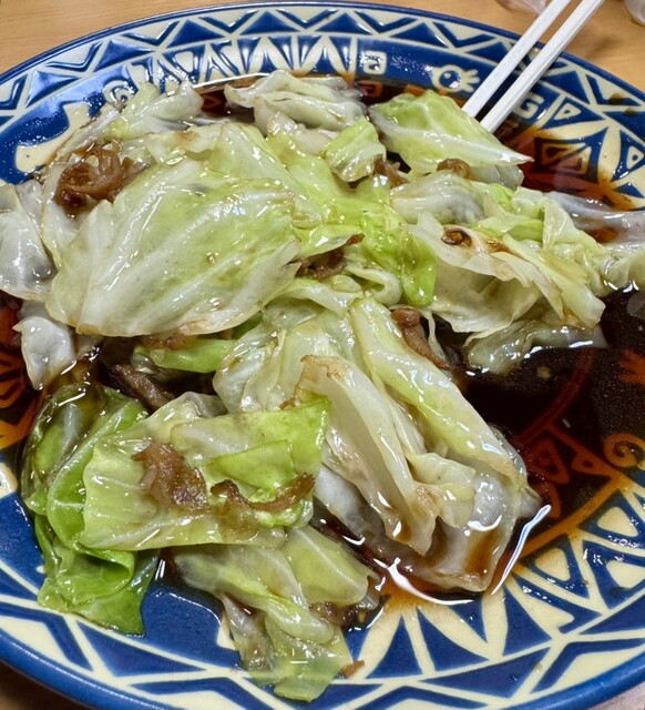 最初は珍しいクジラのタタキ、続いて香ばしい油カスキャベツ炒めとお寿司。