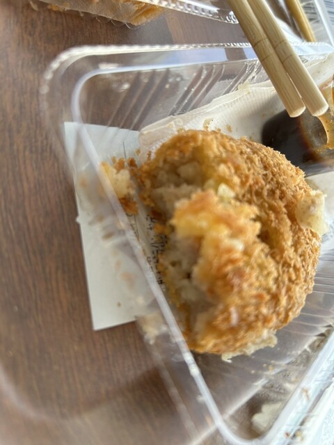 県ぽくに向かう最中見かけて立ち寄りました。ちょうど小腹が空いていたので、トンカツとコロッケ揚げたてを頂きました〜!