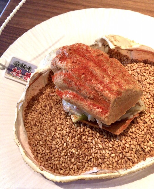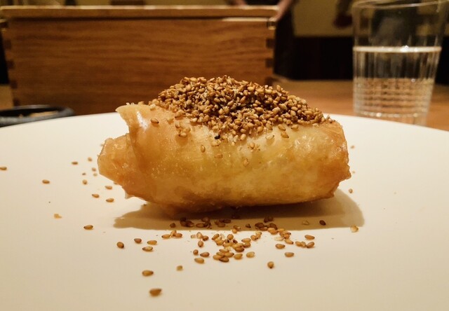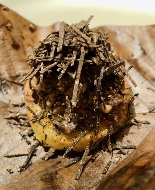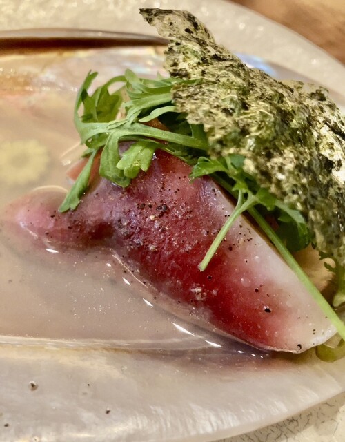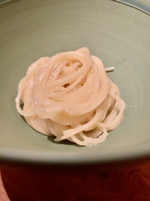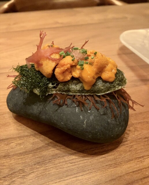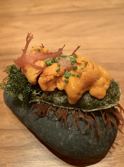 …北海道産の青雲丹、あおさ、福井の地辛子。雲丹の濃厚さ、あおさの香り、地辛子の辛味、どれも風味が強いが、どれかが勝つ訳でなく、三位一体でメチャ美味‼︎唸りました♪