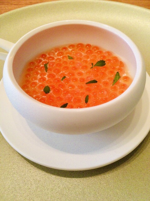 ◇フグの白子とジャガイモのスープ…生の胡椒の粒が、よいアクセントに