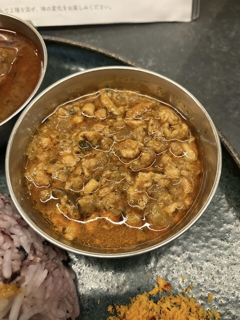 今回は「ビターチキン」、「ネパーリーポーク」、「チキンキーマ」のカレー3種とジェラート2種セットにしました(税込2,100円)。ライスは3種のブレンド(ジャスミン米、バスマティ米、黒米)で、150g、180g、200gから選べるので、200gにしました。なお、+150円で280gにすることもできます。ライスの上にはトマトソースとレモンピクルスが乗っており、味変を楽しむこともできます。