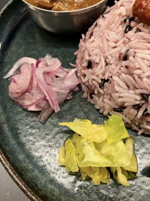 入店から数分ほどで、3種のカレーが配膳されました。中央に紫色のライスが盛り付けられ、その奥にビターチキン(左側)、ネパーリーポーク(中央)、チキンキーマ(右側)があります。手前には副菜の紫玉ねぎのアチャールやキャベツのサブジなどが綺麗に配されていて、食欲をそそります。