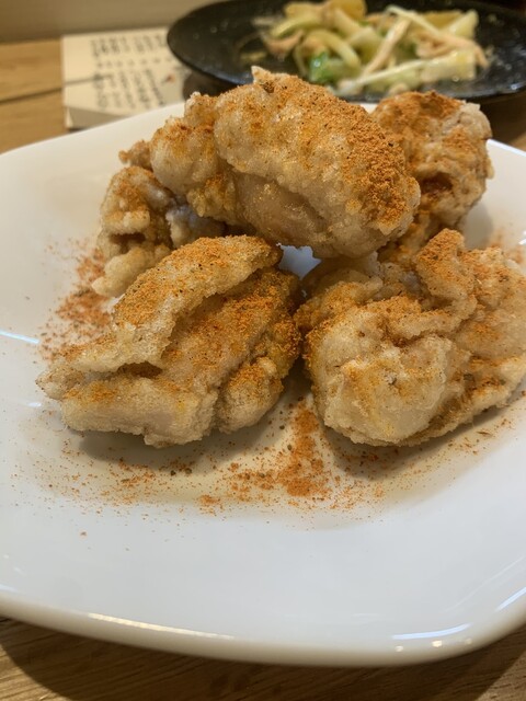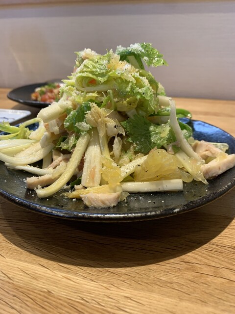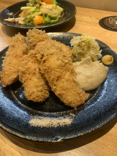 三陸の魚を使った鰹のタタキ、牡蠣フライ、セロリと柑橘のサラダ、