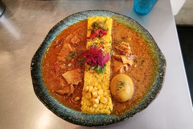 ルーはけっこうスープっぽく、出汁を使ってるせいか、スパイスはよく効いてるものの、とても食べやすくて、深い味わい。南アジアにある強烈なスパイスと脂こってり感は全くありません。モツの臭みもほとんどなく、甘めのハニーチキンカレーと辛口のモツホットポークカレーが絶妙なバランスです。