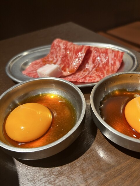 ◎黒毛和牛のぜっぴんカルビ。¥680。見た目:味:お肉一枚に付き一つ卵黄がつくのでコスパ高く肉が柔らかくてオススメ!頼むべき商品!