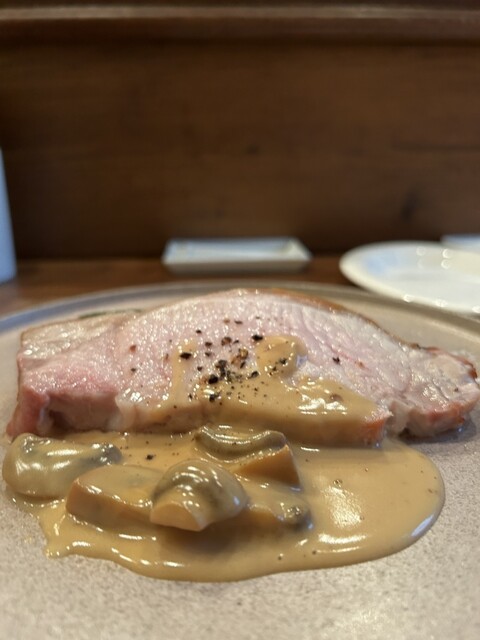●もち豚ロースとマッシュルームのクリームソース。見た目・味:添え付けの野菜たっぷりで豚肉も食べ応えありパンも添え付けてありクリームソースと合わさりシンプルで美味い!
