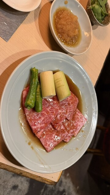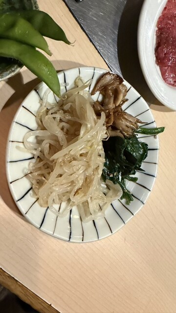 枝豆の突き出し、ハツ刺し、タン、ナムル、ご飯、ホルモン、ハラミ、ハツアブラ、ヤン、ザブトン。