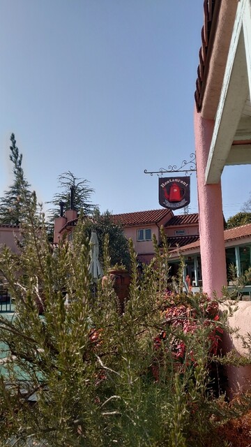 昼食は、9番ホールと18番ホールの先に建つ、濃いピンクのテラスレストランでとります。女性に人気なのが納得出来るオシャレな南欧風の建物です。
