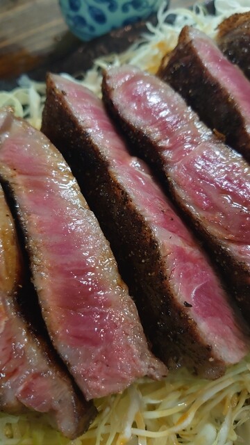 トリに出て来たのは、最初に頼んだ「和牛サーロインステーキ」。網焼きされたお肉は、中はレア気味に、表面は香ばしく焼かれています。たっぷり盛られたキャベツと合わせて食べると、ヘルシーさも感じながら肉食が出来ます。