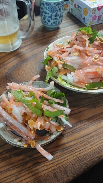 前回は後半に「和牛サーロインステーキ」だったので、今回はのっけから注文しました。同時に大根サラダ。このサラダがボリュームたっぷり。2人でずっと食べ切れなかったほど。酸っぱさがもつ焼きの合間を調整してくれる優れもの。