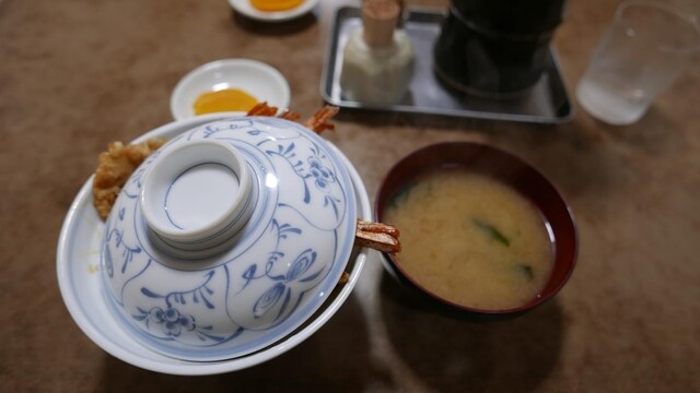 固めに炊かれたご飯の上に乗ったフリッター状の衣に包まれた海老とイカ、甘さの抑えられた香ばしくビターな天つゆ。