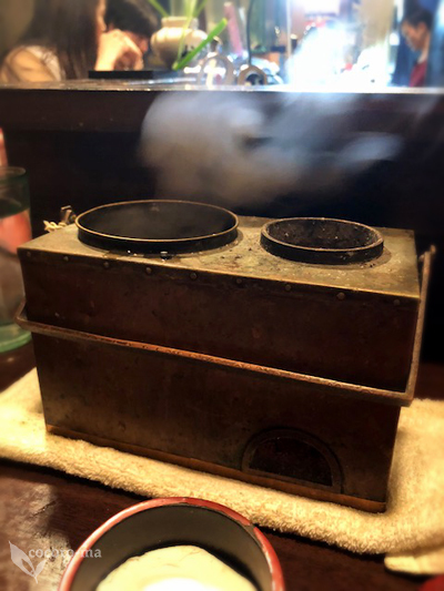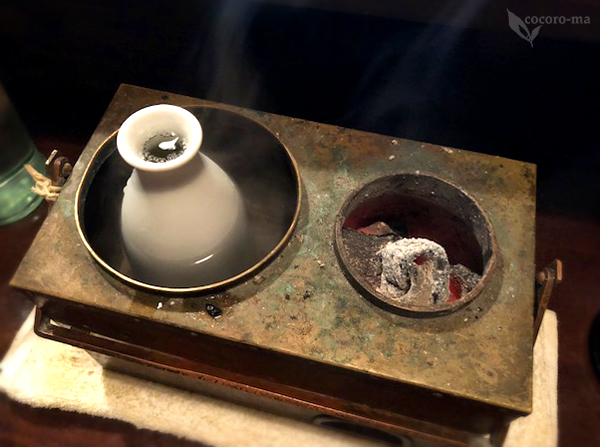右の空間には炭が入れられ、左の空間には徳利を温めるお湯が。