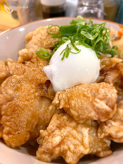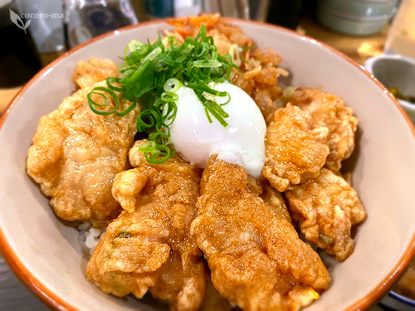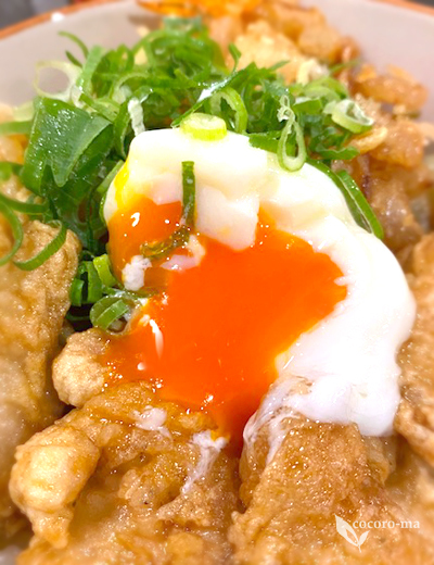 この日は河豚とかしわと野菜のかき揚げの上に、温玉がのせられた天丼がメイン。
