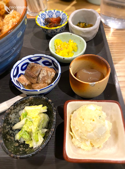 玉こんにゃく、お魚の煮付け、ポテサラ、お漬物数種。
