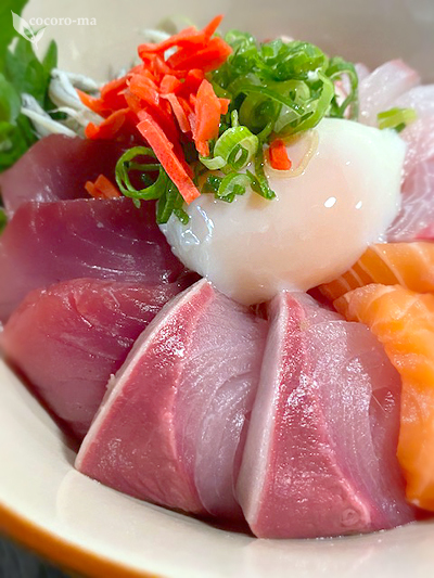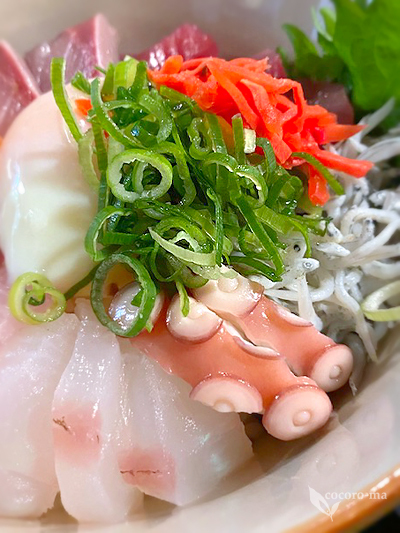 マグロ、ハマチ、サーモン、タコ、シラスなどがてんこ盛り。
