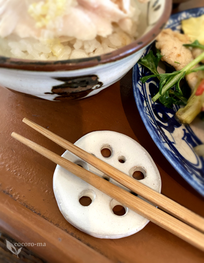 蓮根型の箸置きがかわいらしく。