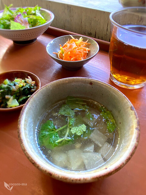 滋味深い味わいのスープ、温かいお茶がセット。