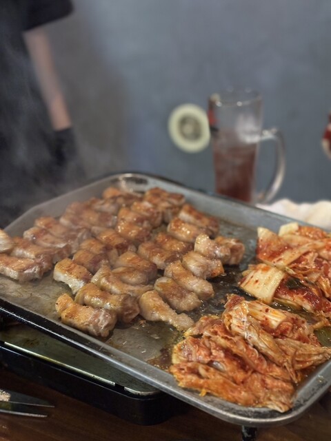 熟成肉のサムギョプサルはお肉がとっても肉厚でジューシー。焼きキムチとセリとサンチュで包んでいただきま〜す。とっても美味しくてボリュームもあって大満足でした✨