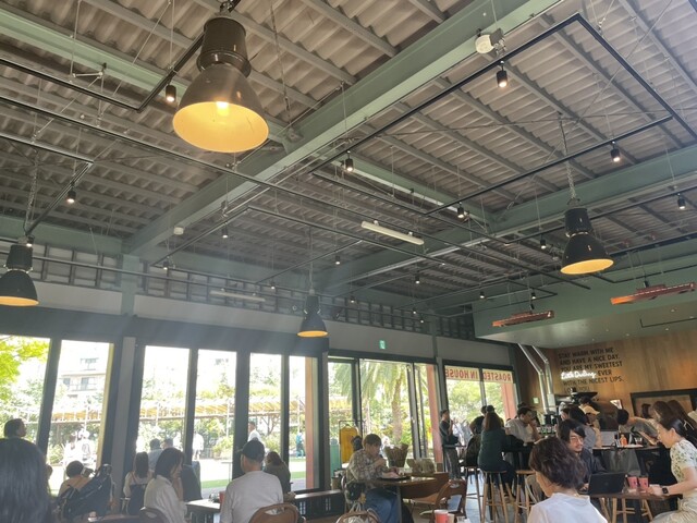 ガラス張りの店内で、コーヒーやハンバーガー、種類豊富な大きなペイストリーから選んでキャッシュレスでお会計、ベルをもらって出来たら取りにいくシステム。