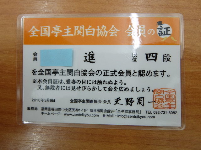 全国亭主関白協会 段位認定証!!