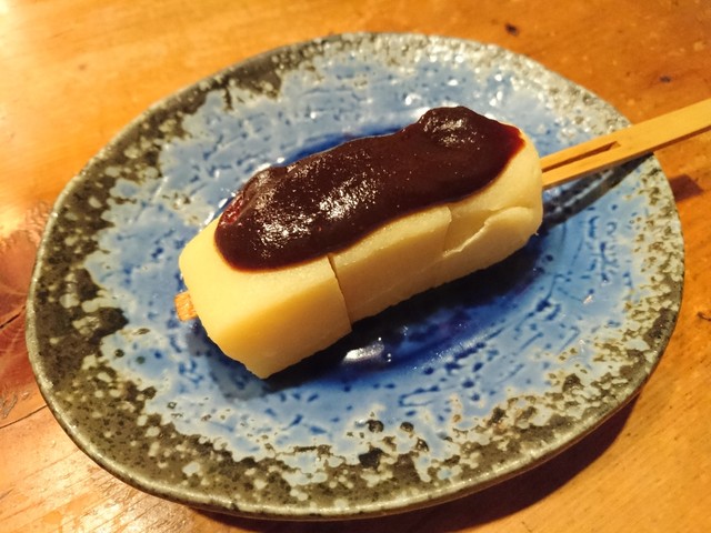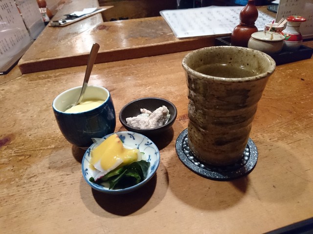 芋焼酎で乾杯、お通し3品をアテに始めます。少量ながらどれも質の高いお通し、最初に茶碗蒸しを頂いたのは初めてかもしれません^^; 友人のでんがくをおすそ分けで頂きます、プルプル食感に濃厚な味噌がよく合います。