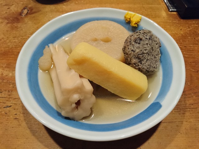 おでんは京風でしょうか、出汁は薄く上品な味わい、下拵えしたおでん種を出す直前に純銅ひょうたん鍋で少し煮込む形式、最初に大根・ちくわぶ・鶏つくねを頂きます。大根は適度な軟らかさ、煮込んだゆるゆるもいいですが食感の残る硬さも良いですね。ちくわぶはかなり弾力が強く食べごたえあるサイズ、つくねはスパイスがしっかり効いた当店独特の味付けです。