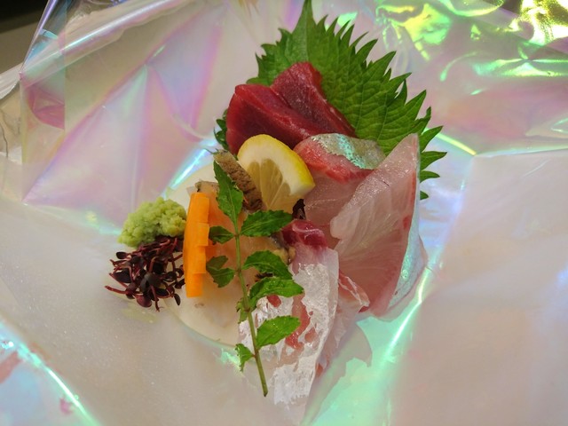 まずは生ビールで乾杯、突き出しの焼き穴子ときゅうり和えをアテに飲み干します...至福の時間ですね。刺盛りは氷の器で登場、溶けても水に浸からないよう薄ナイロンを敷いています。鯛のコリコリ感でお酒が益々進みます。