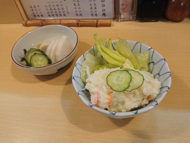 注文は「ロースカツ定食(2300円)」、先にランチ系がどんどん出来上がりますね、定食系は少し遅れて配膳です。ポテサラ・漬物・豚汁が付いてきます!