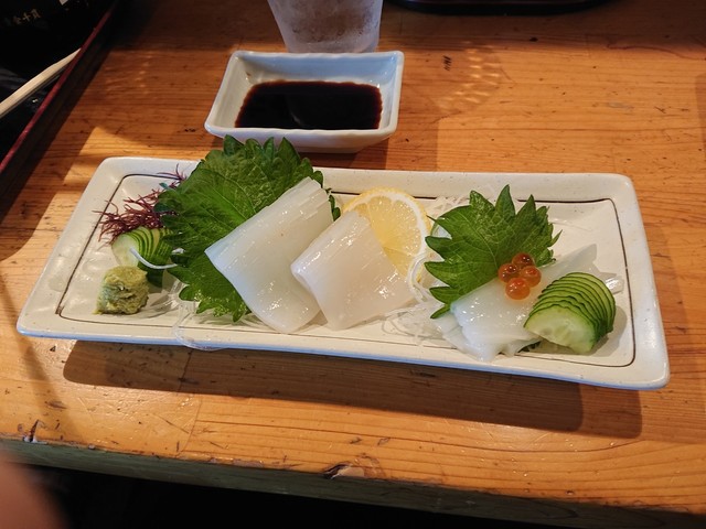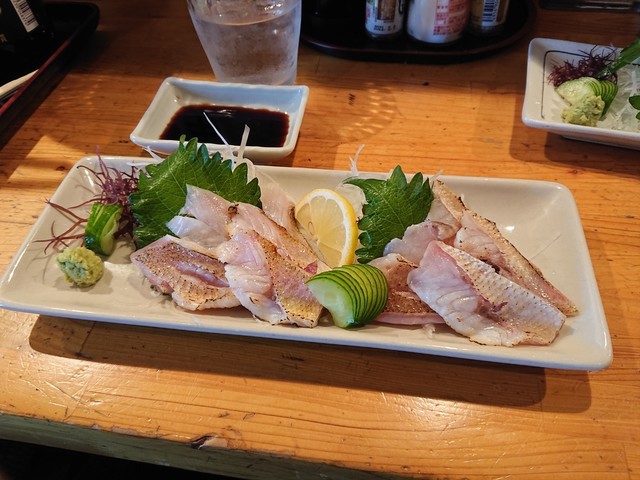 名物の焼印が入っただし巻き、見た目通り硬めの食感、ほんのり甘い味わいは癖になります。貝の刺身(名称失念!)は新鮮さが伝わる食感、食べる直前まで収縮していました^^; 初鰹は専用の醤油で頂きます、しっとりした食感の身には旬の旨味がたくさん詰まっていました。