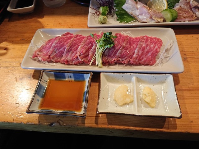 イカ刺し、今季は烏賊不漁で価格高騰しているようですね、しっかり味わって頂きましょう!。牛刺、脂の入り方が絶妙ですね、口中ですぐに溶け出し甘みを感じながら味わえます。