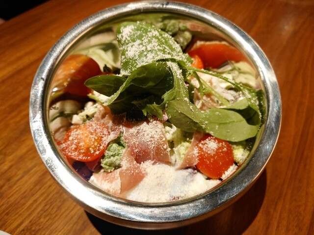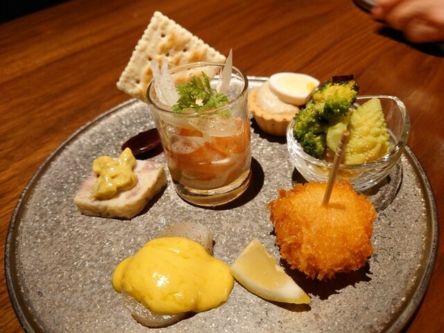 カクテルで喉を潤しながら前菜盛りを頂きます、和風っぽい円形器には5種入っています、どれも良いアテになりますね、鴨生ハムは滋味深い味わい、ベーコンとわさび菜のフリタータはボリュームあります。バーニャカウダはひとり用に小皿で登場、アンチョビが入ったソースは絶品ですね、野菜系だと全部合うでしょう。