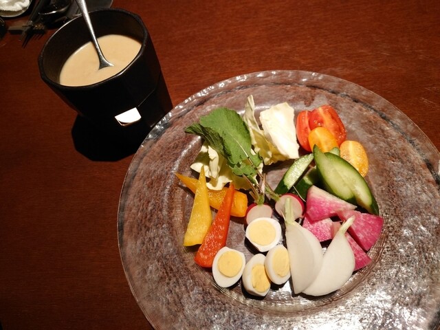 生ビールで乾杯、予約時に注文できる前菜盛り合わせを頂きます、繊細な仕上がりで8種の味わいを楽しめます(*^^*) 彩り野菜のバーニャカウダ、新鮮な野菜を温かいアンチョビソースで楽しみます!! このアンチョビソースが絶品、このソースだけで良いアテになります^^;