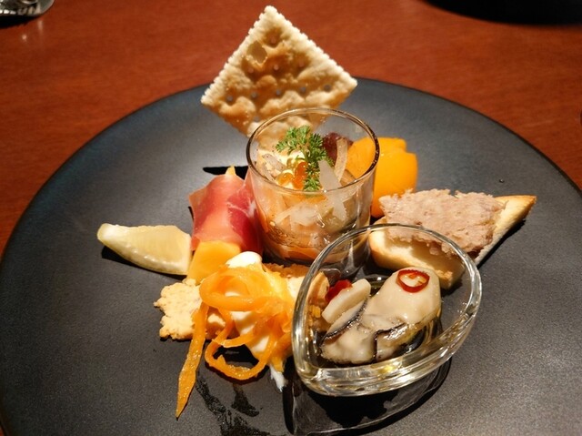 生ビールで喉を潤和して前菜盛り合わせを頂きます。7種の繊細な料理はどれも美味しいですね、酒が進む内容と構成になっています。この時期特有の大きな牡蠣のマリネと金柑甘煮が特に好みの味わい、事前予約必須の前菜盛り合わせはお勧めです。