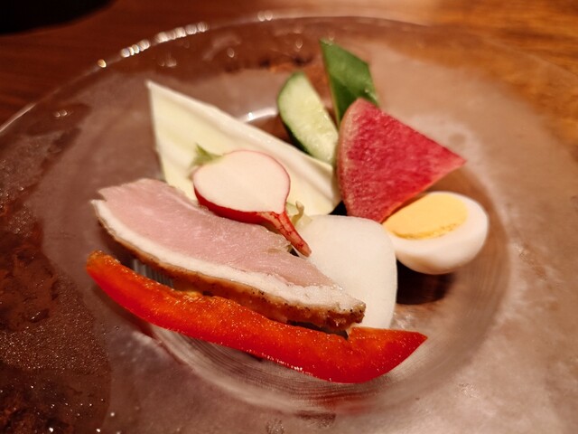 ジントニックを注文し乾杯、アテはおまかせで3~4品をお願いしました。最初に出てきたのは「自家製鴨の生ハム」、脂が分離されており見た目よりあっさり、これはどのお酒にも合うメニューですね、胡椒・香辛料で美味しく頂きました。次は「豚肉パテドカンパーニュ」、100%豚肉だけで作られています。見た目もカラフル、目からも美味しさが伝わってきます。マスタードが味を引き締める役割を担っています。