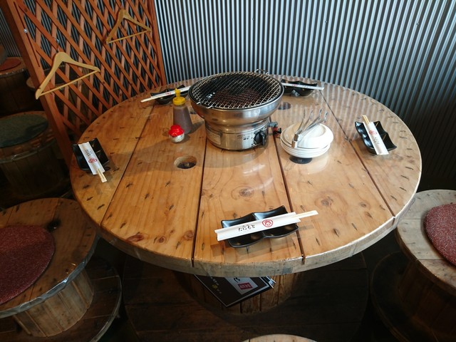 店内はカジュアルな雰囲気ですね、ケーブル巻取り?テーブルと椅子をビニールで覆った調度、排煙装置は各テーブル毎に備え付けられています。