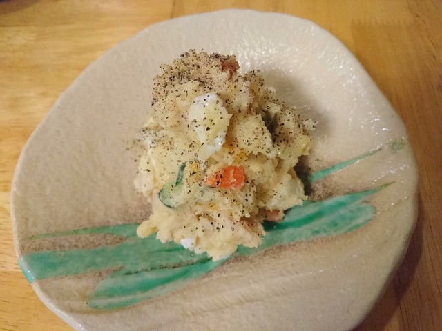 生ビールと突き出しで開始、名物のひな鳥素揚げは30分ほど調理時間が掛かりますので先に注文、すぐに出てきたポテサラで生ビールを流し込みます^^;