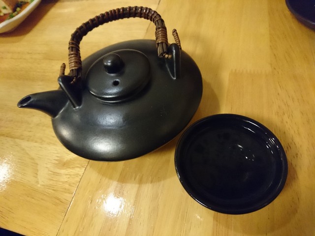 外かわパリパリ、中はしっとりの厚揚げ(絹揚げ)は絶品、しっとり感が残った蓮根チップも良いアテになります。当店は芋焼酎のラインナップが素晴らしいです、湯割りでお願いすると黒急須でやって来ました、冷めにくい仕様は嬉しいですね。