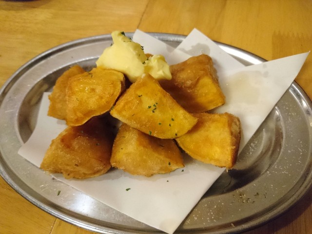 軟骨唐揚げはカレー味、薄塩も効いていて良い焼酎アテになります。最後は安寧芋揚げで〆、バターをのせてシンプルに味わいました!。どのアテも一手間・一工夫されており、芋焼酎も豊富に揃った当店、お薦めですよ^^