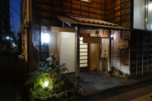 日が暮れて気温も一気に低下、今宵は外で液体燃料を注入です。仕事関係で二階座敷席を利用することの多い和楽さん、店を構えられての歴史はそれほど長くはないですがオープン当初から名店の名を縦にされておられます。