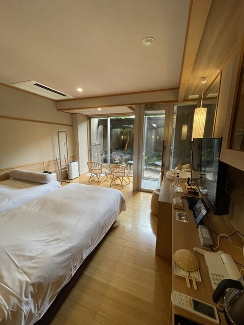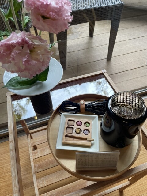 ミニマルで落ち着く、いい香りのお部屋。生花があるのも嬉しい。電子香炉で、好きな香りを楽しめます。こんなに香りを大切にしている旅館は初めて!大好き!!