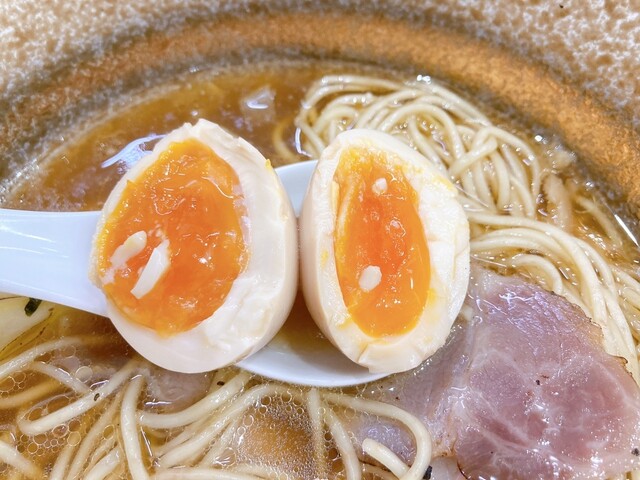 ちょっと遠征し、平日12時過ぎに初訪問。かなりの人気店らしいので行列を覚悟して行ったが、並びなく入店できた。ちょうど店外に出てきた店員さんに基本メニューを聞いたら醤油とのことで、具が全部入りの「鴨出汁arakawa醤油」1,000円を購入。