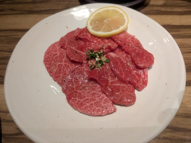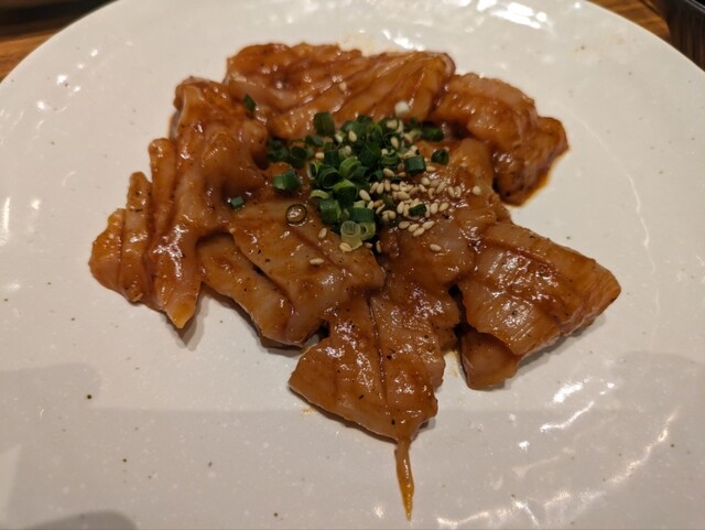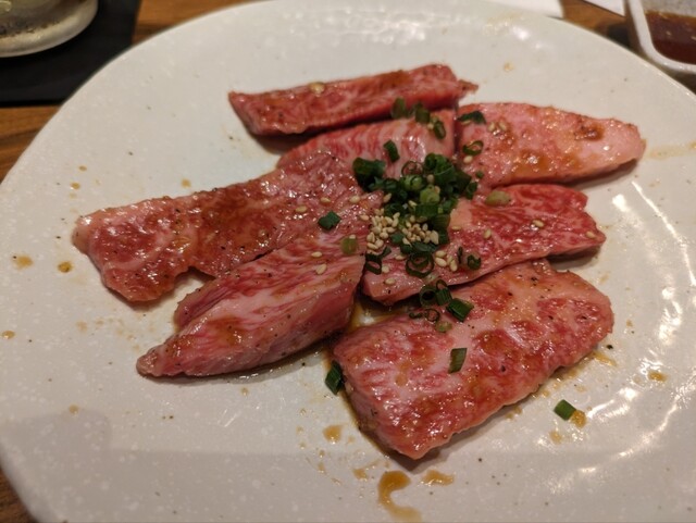 さてここのおすすめはなんと言ってもスカートと呼ばれてるハラミ。今日も特選和牛ハラミを注文しました。他店とは別格の霜降りそしてジューシーさ。ふわふわ食感がたまりません。何皿でも食べられそうです。