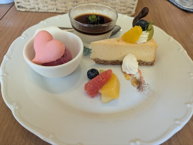 オレンジのベイクドチーズケーキ、コーヒー風味のパンナコッタ、カシスシャーベットを選択しました。暑いのであえて喉越しが良いもので揃えてくれてあるのかも。アイスオーレもミルクが濃厚で充実したランチでした。